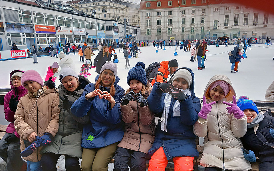Auch beim Eislaufen hatten die Kinder großen Spaß. Die Ausflüge führten einmal zum Eislaufplatz in Schwechat und einmal zum Wiener Eislauf-Verein im 3. Bezirk. Dort lernten sie gemeinsam Schlittschuhlaufen, unterstützen einander und erlebten viel Freude und Bewegung.